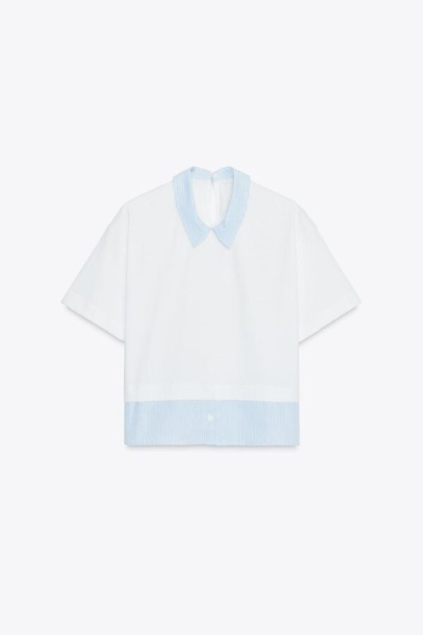 تیشرت یقه دار پارچه‌ای زارا ترکیبی از طراحی کلاسیک و جزئیات مدرن است که برای کسانی طراحی شده که دنبال استایل خاص و متفاوت هستند. این تیشرت دارای یقه گرد با ترکیب پارچه متضاد است که جلوه‌ای چشم‌گیر و منحصر به فرد به آن می‌بخشد. آستین کوتاه و لبه‌هایی که با پارچه ترکیبی دوخته شده‌اند، ظاهری شیک و جذاب به محصول داده‌اند. همچنین در پشت تیشرت بازشویی با دکمه وجود دارد که علاوه بر زیبایی، امکان تنفس بهتر و راحتی بیشتر را فراهم می‌کند.